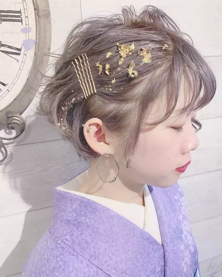 ショートヘアよりも短めのスタイルです。 ベリーショートの持ち味はスタイリングが比較的簡単なこと。 といっても、成人式の当日は美容師さんにセットしてもらう人が殆どでしょう。 逆毛を出したり、スプレーなどで固定していく過程で、 普段の自分とは違うスタイルになります。 プロ ショートヘアはアレンジの幅が少ないですが、その分、華やかな髪飾りがとっても映える髪型。 耳かけをしたり、前髪をねじってみるなど、ちょっとしたアレンジを加えるだけでも、周りと差がつきますよ。 成人式向け着物アレンジのコツ 髪飾りにこだわる